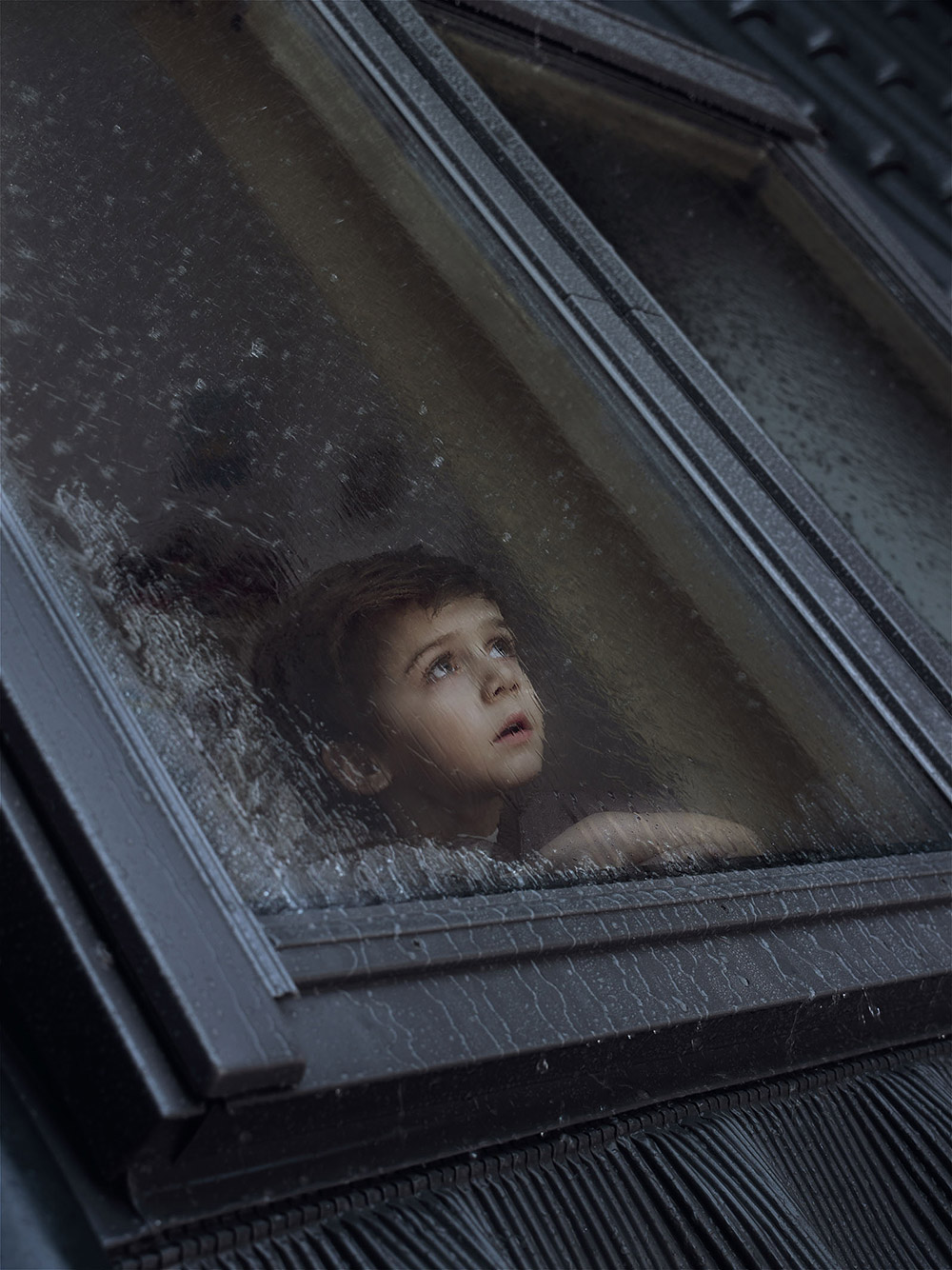 Kleiner Junge, der besorgt aus dem Dachfenster auf ein Unwetter schaut