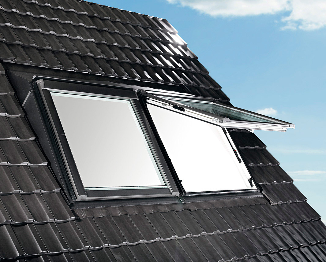 Auch für den Einbau von Dachfenstern, die sich über den First erstrecken, braucht es einen speziellen Eindeckrahmen, der den Winkel des Firsts genau trifft und besonders gut abdichtet.
